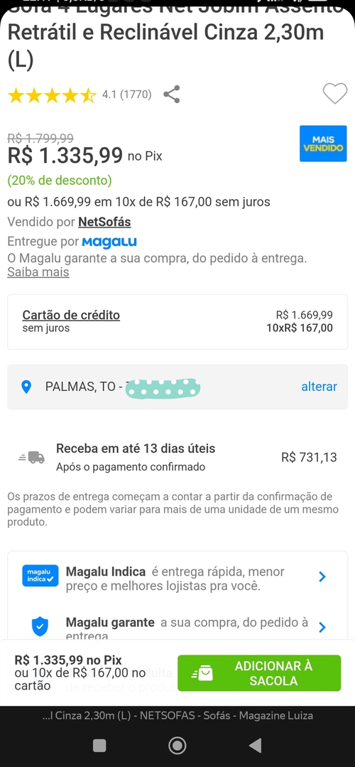 Comprei, frete grátis para Brasília, aguardar entregar, estava atrás de um sofá grande a uns meses.