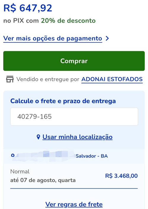 R$1.468 de frete. Entrega até 23 de julho, ou seja, dois meses. Falta bom-senso. Como é difícil de acreditar que alguém pegaria três vezes o valor do produto só de frete, deveriam dar como indisponível, porque, na prática, é isso mesmo.