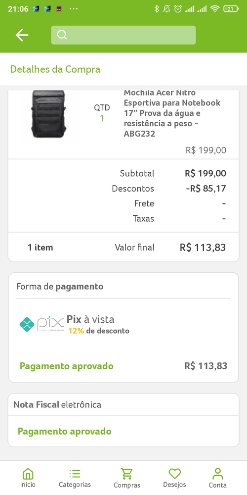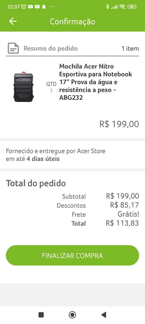 Tô tentando comprar essa mochila desde ontem pelo App da Acer e o pedido sempre é cancelado.