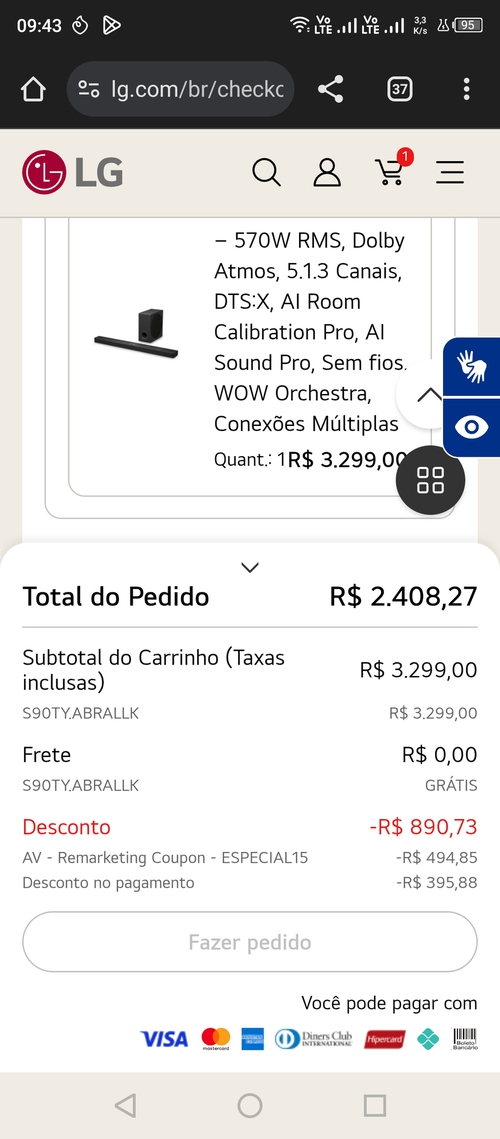 Soundbar LG S90TY – 570W RMS, Dolby Atmos, 5.1.3 Canais, DTS:X, AI Room Calibration Pro, AI Sound Pro, Sem fios, WOW Orchestra, Conexões Múltiplas