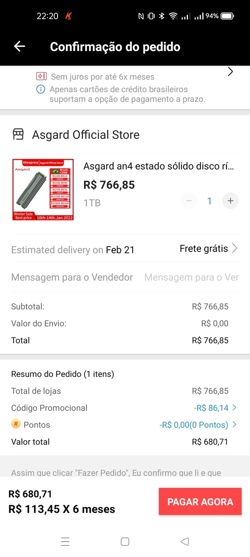 Em até 6x sem juros. Lembrando que o produto pode ser taxado na chegada ao Brasil, mas SSD dificilmente é taxado. Este cupom costuma acabar rápido, mas volta de tempos em tempos. Mesmo sem cupom o valor está excelente.
