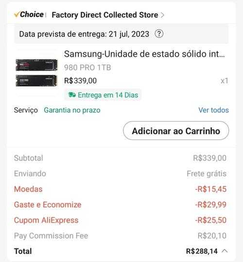 Comprei um 980pro 1tb por 254 no dia 16 de junho e chegou no Br dia 22 e não atualizou mais, tô achando que sou ser taxado. Geralmente não dura tanto assim, no máximo 4 dias e passa sem taxa porque compro bastante SSD para revenda de outras marcas mas esse já tá com 9 dias e nada de passar. Só um relato pra quem tá pensando em pegar e acha se vai ser taxado ou não.