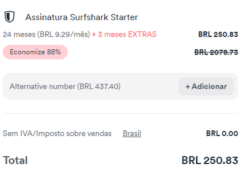 O plano Surfshark Starter têm uma assinatura de 2 anos + 3 meses EXTRAS = ficando no valor de 250,83 reais (ao todo) e pago 9,29 reais por mês.