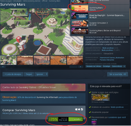 Boas-vindas ao lar! Chegou a hora de tomar conta do planeta vermelho e construir as primeiras colônias humanas funcionais em Marte! Você só precisa de suprimentos, oxigênio, décadas de treinamento, experiência com tempestades de areia e uma atitude proativa para descobrir o propósito daqueles estranhos cubos pretos que apareceram do nada. Com um pouco de arrumação, esse lugar vai ficar incrível! Surviving Mars é um jogo de construção de ficção-científica sobre colonizar Marte e sobreviver ao processo. Escolha uma agência espacial para ter recursos e apoio financeiro antes de determinar a localização da sua colônia. Construa redomas e infraestrutura, pesquise novas possibilidades e utilize drones para liberar mais modos elaborados de moldar e expandir sua colônia. Cultive sua própria comida, busque minerais ou apenas relaxe no bar após um duro dia de trabalho. Mas o mais importante de tudo, mantenha seus colonos vivos. Não é uma tarefa fácil em um planeta novo e estranho.Haverá desafios para superar. Execute sua estratégia e melhore as chances de sobrevivência da sua colônia enquanto desvenda os mistérios deste mundo alienígena. Tudo pronto? Marte aguarda por você.