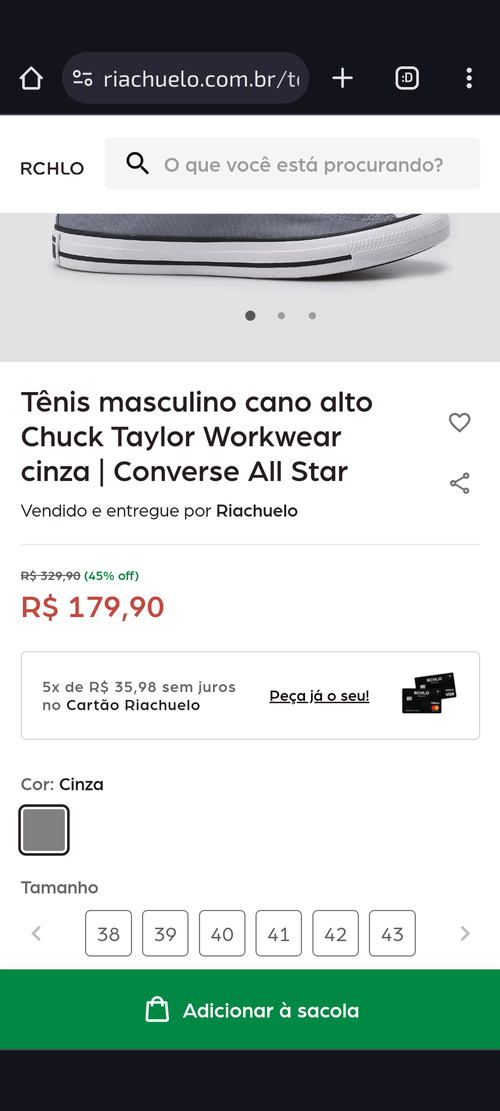 Peguei! Entrega, embalagem e produto enviado pela Riachuelo: produto novo sem sinais de exposição, bem embalado e entregue em 2 dias. Sobre o produto: Peguem um número a menos, essa é a regra pra All Star, calço 42 e o 41 ficou perfeito. Frete 10 pila ou levar algum item que precise pra fechar frete grátis a partir de 199$. Valeu guys!