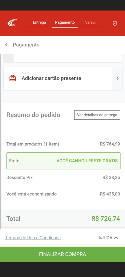 726 reais no pix ou 764 no cartão em até 10x