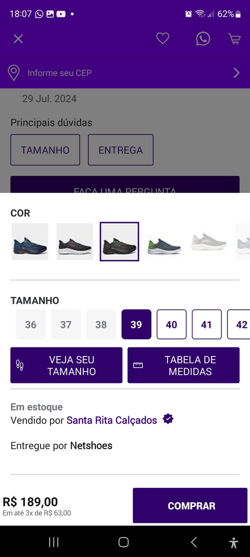 Abre, mas ao colocar tamanho 39, o preço sobe para 189,00