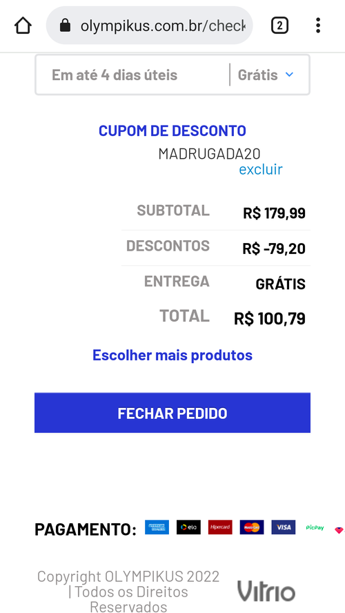 Cupom de 20% de desconto, consegui fechar o pedido por R$ 100,79.