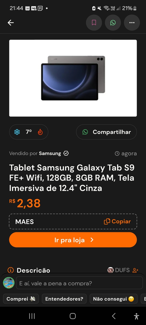 O valor não está bom. O mesmo tablet com o galaxy buds sai por 100 a mais comprado também na Samsung em promoção que aparece com regularidade para estudante.