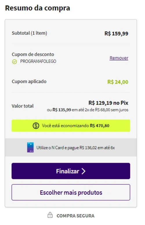 Depois disso, copia o cupomPROGRAMAFOLEGO do Pelando e cola lá no carrinho.