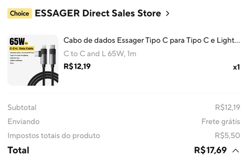 [Taxa inclusa] Cabo de dados Essager Tipo C para Tipo C e Lightning, PD 65W, 2 em 1