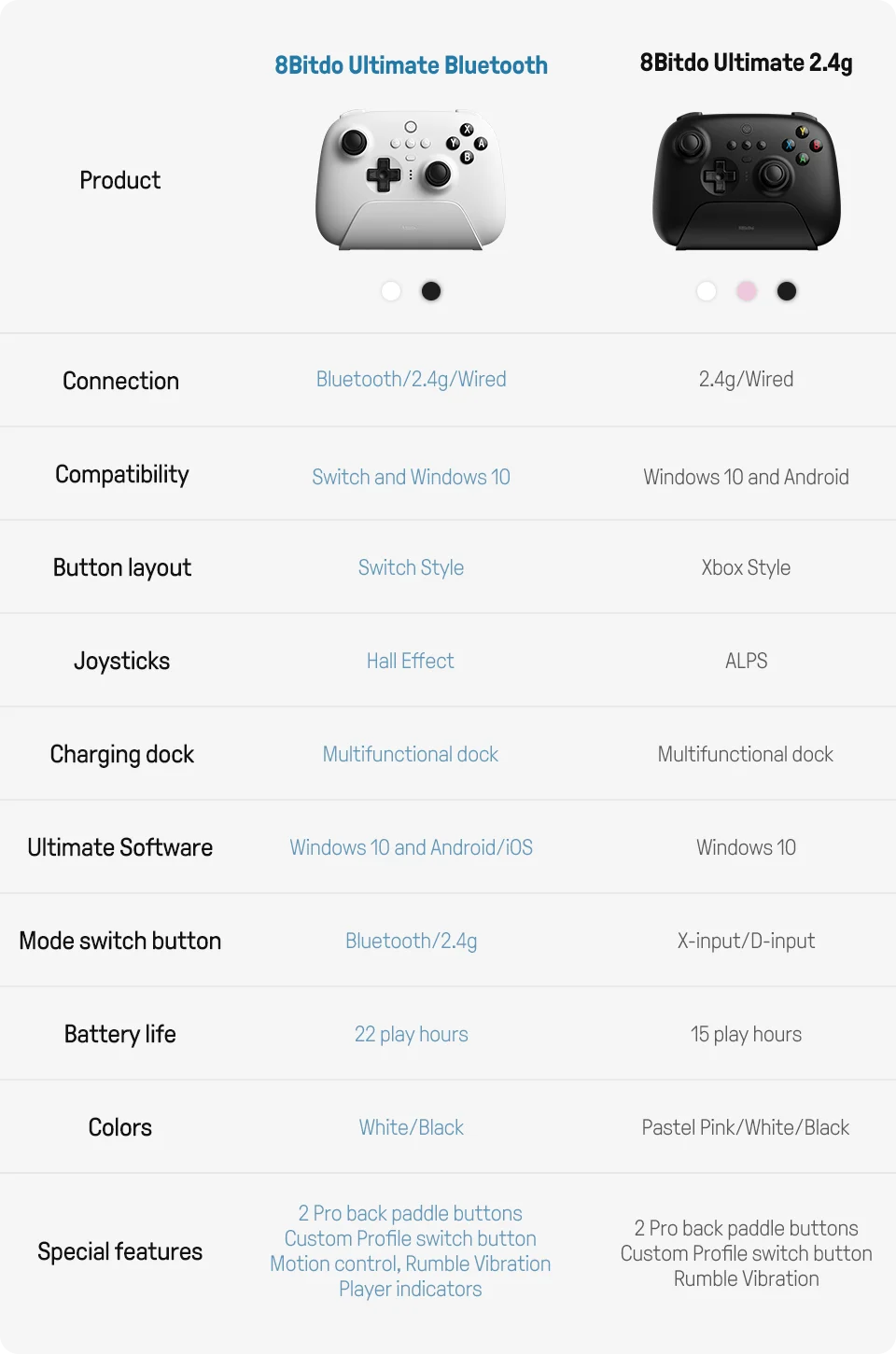 Lembrando galera: a 8BitDo lançou recentemente a versão Ultimate 2.4g com analógicos Hall Effect e Blutooth também, porém sem compatibilidade com Nintendo Switch e menor duração da bateria.