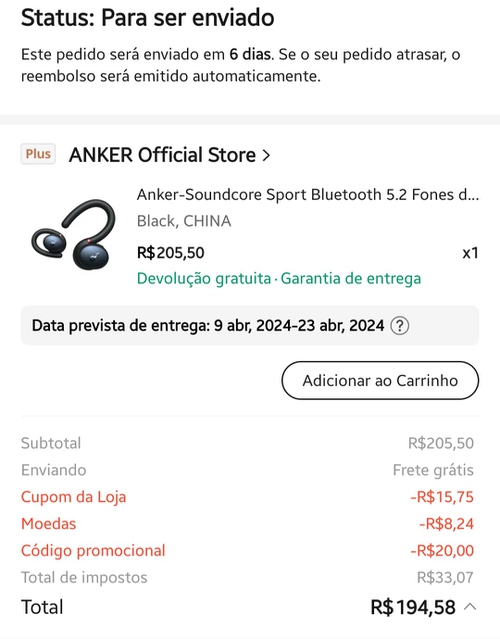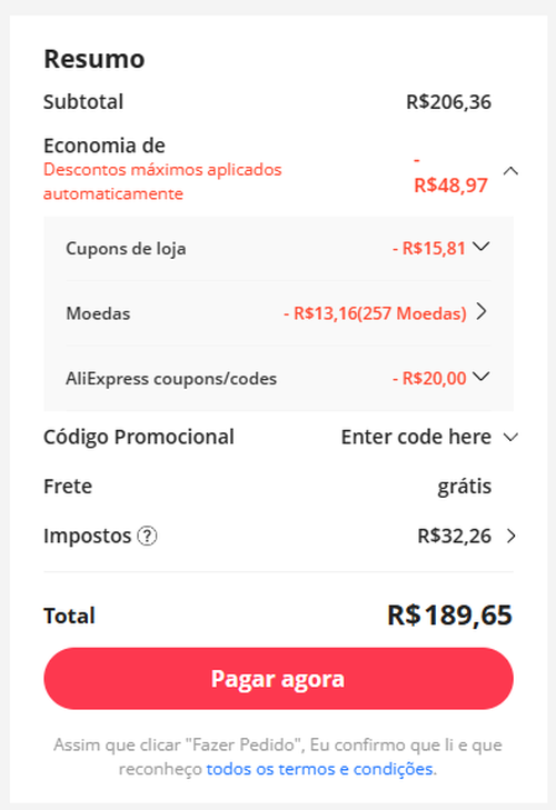 Pra mim ficou r$234. Isso que aplicou um cupom de r$20 e outro de r$15. O engraçado é que mostra pra mim que o produto custa r$230, aí no fim fica mais caro kkkkk