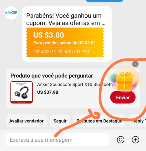 2 - Depois abrir a página do Chat, você vai ver o ícone de um presente. Clique sobre para enviar.