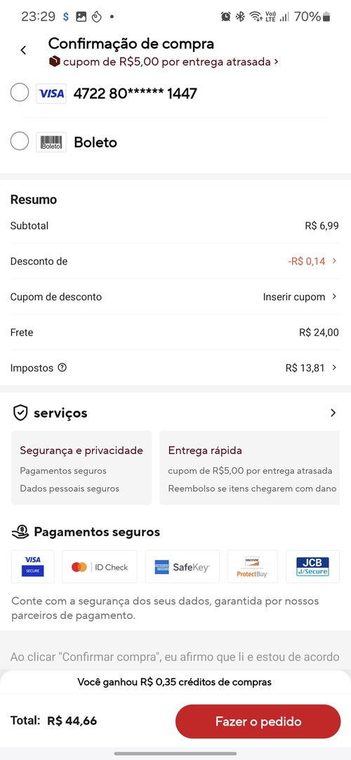 - Quando o produto da promoção aparecer no aplicativo do Aliexpress, prossiga até o final, na tela de "Confirmação do pedido".