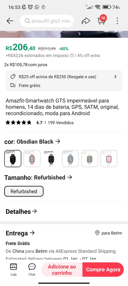 [Taxa Inclusa/Moedas/G Pay] - Smartwatch Amazfit GTS Com GPS Integrado ''Recondicionado''