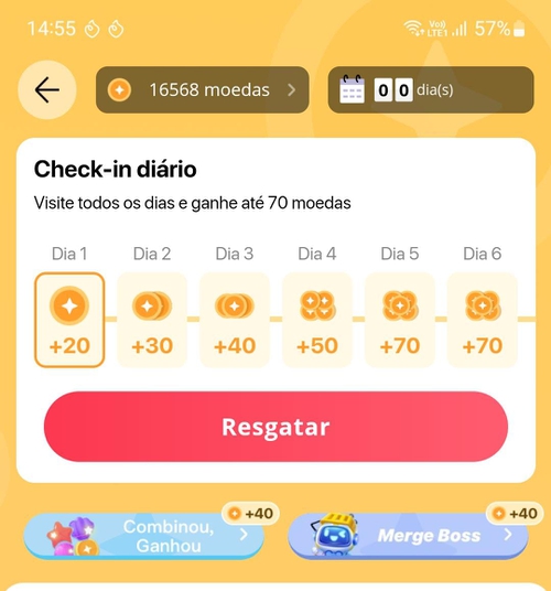 (Você pode resgatar no App e no PC, recebe moedas em ambos os casos), cada dia vai aumentando o valor das moedas a serem resgatadas)