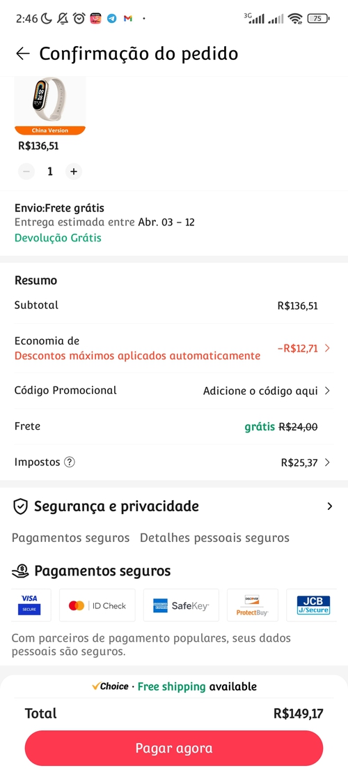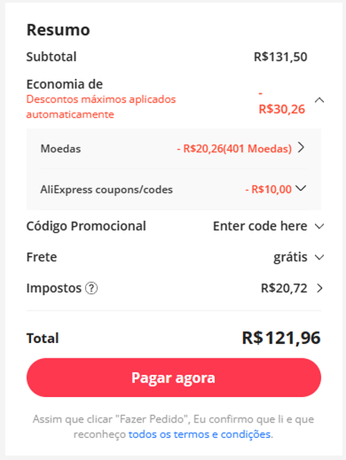 Valor considerando considerando uso do cupom e desconto automático por moedas. Versão Chinesa