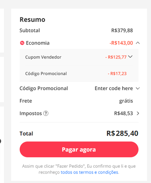 Fiz uma conta nova e o relógio estava 350 reais. Na página de venda, tinha um cupom do vendedor com desconto de 120 reais, aí saiu a 273 reais pra mim, porém não consegui adicionar outro cupom em conjunto.