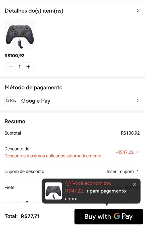 Como eu tenho iPhone, eu efetuei a compra pelo pix no app (o cupom só funciona no app), depois eu troquei a forma de pagamento para gpay no site pelo computador e paguei com o Gpay, entrou o desconto e efetuei o pagamento.