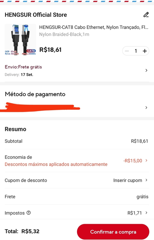 A loja está com o cupom, o cabo sai grátis