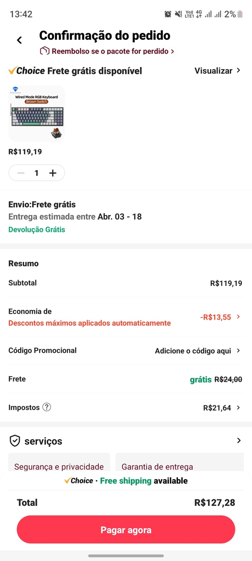 Tenho esse teclado também, na época, peguei com switch brown e paguei até um tanto mais caro que isso (foi R$193 com impostos).