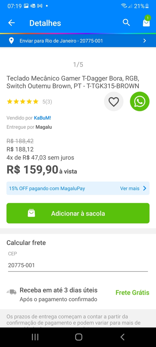 Eu fiz o seguinte: copiei o nome todo do teclado e fechei a página do Magazine pelando. Abri o APP da Magalu e colei o nome do teclado, veio o mesmo preço com frete grátis para o Rio de Janeiro.