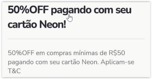 Por meio desta oferta, divulgamos os Termos e Condições da campanha “Neon - 50% OFF - Outubro”, por meio da qual os usuários que realizarem compras com o cartão Neon, acima de R$ 50,00 (cinquenta reais) no aplicativo Rappi, terão desconto de até 50% (cinquenta por cento), limitado à R$ 50,00 (cinquenta reais) no pedido.