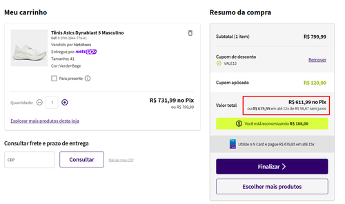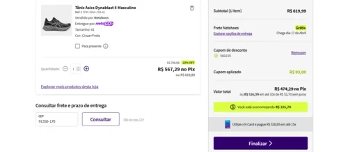 Funcionando aqui, 474 no pix ou 526,99 em 10x. Esse tenis é excelente (é praticamente o Novablast 3) e o branco (que na verdade é um verde beeem leve) é lindo. Acho que nessa faixa de 500 reais ele é o mais balanceado entre conforto/responsividade/retorno de energia/durabilidade, pra quem quer um pau pra toda obra nessa faixa de preço é o melhor custo-benefício, vale demais.