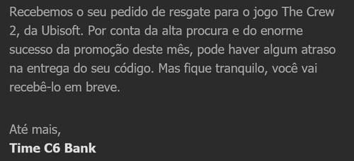 Clientes C6bank estão podendo resgatar a versão completa do jogo the crew 2 na ubisoft connect no pc, também é possível criar uma conta para resgatar.