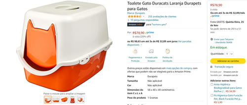 Estou monitorando preço desse sanitário para gatos há meses. Esse é o melhor preço, ainda mais considerando o frete grátis para clientes prime, se olharem no mercado, o mesmo toalete está girando em torno de 90, 100 reais (inclusive, dá pra ter uma noção olhando as outras cores). Como aproveitei a promoção, também estou compartilhando para quem tiver gatinhos em casa. Melhor forma de manter o odor "isolado" em um local, rs