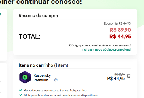 Pela oferta direto na tela de licença do Antivirus, peguei 2 anos pra 1 dispositivo por 44,95, nessa tela dos cupons ele está meio inflado.