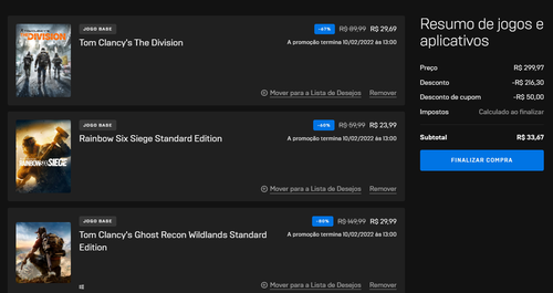 Entre no link do Rainbow Six Siege, The Division e Ghost Recon Wildlands abaixo e coloque os jogos no carrinho, o preço dos 3 vai ficar por R$ 33,67 usando o cupom de R$50 de desconto da Epic