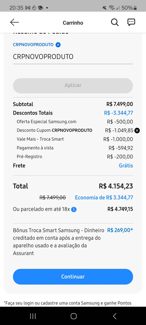 Finalmente consegui, peguei no pix pq vendi meu A35, uma pena não poder parcelar esse valor de 3300, o meu problema era: o bônus de 200 era num e-mail e minha conta no app era outro. Tava quebrando a cabeça, acabei cancelando a compra no telefone e comprei de novo no novo email. Obrigado