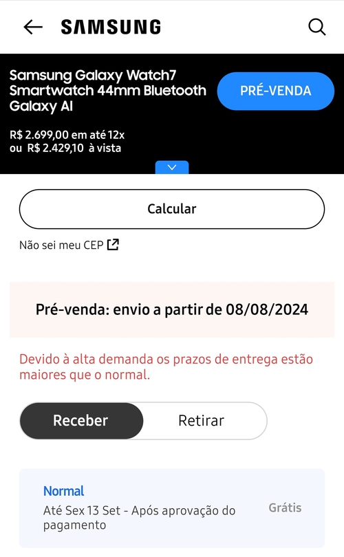Estava fechando o pedido, mas desisti quando vi que esse valor é no PIX a vista pra receber o relógio só em setembro.
