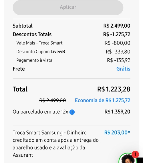Aqui o desconto não entra no carrinho. Fica apenas aparecendo embaixo o valor que receberia pelo produto trocado. Loja da Samsung é ruim que nossa.