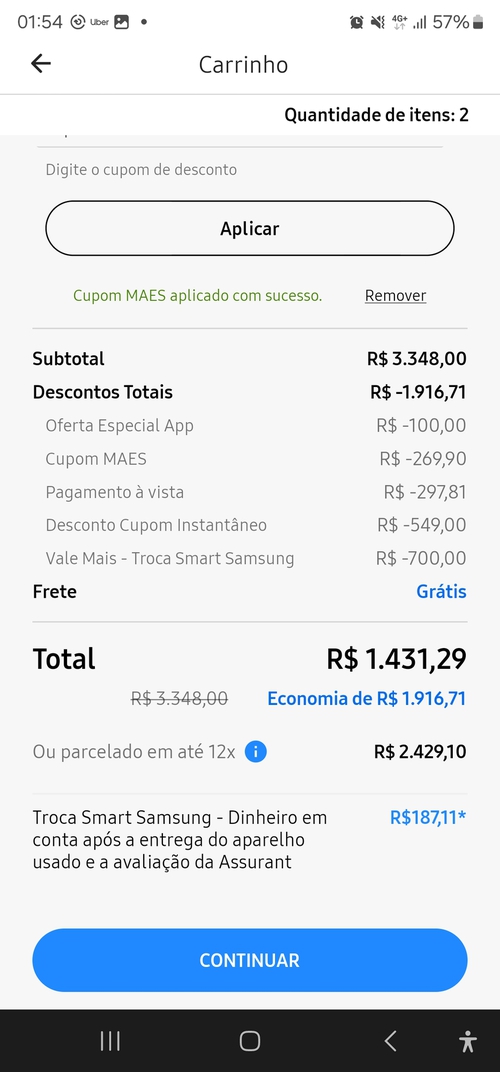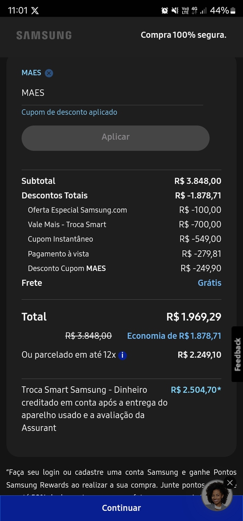 Pra quem não está aparecendo o desconto do Troca Smart, fica adicionando e tirando 1 unidade a mais do celular. Quando comprei, só apareceu depois de umas 20 tentativas.