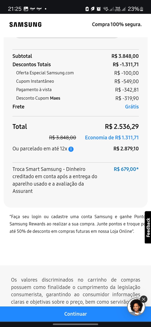 Consegui. Paguei de 1x pelo Samsung Pay e ainda ganharei pouco mais de 3000 pontos dessa compra. Agora é esperar chegar.