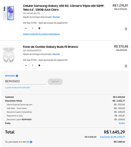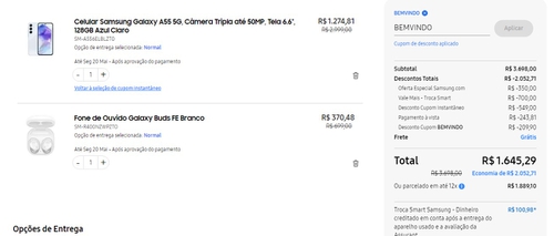 O A55 de 256GB + Galaxy Buds FE (branco), nessa mesma promoção, está por R$2050,00.