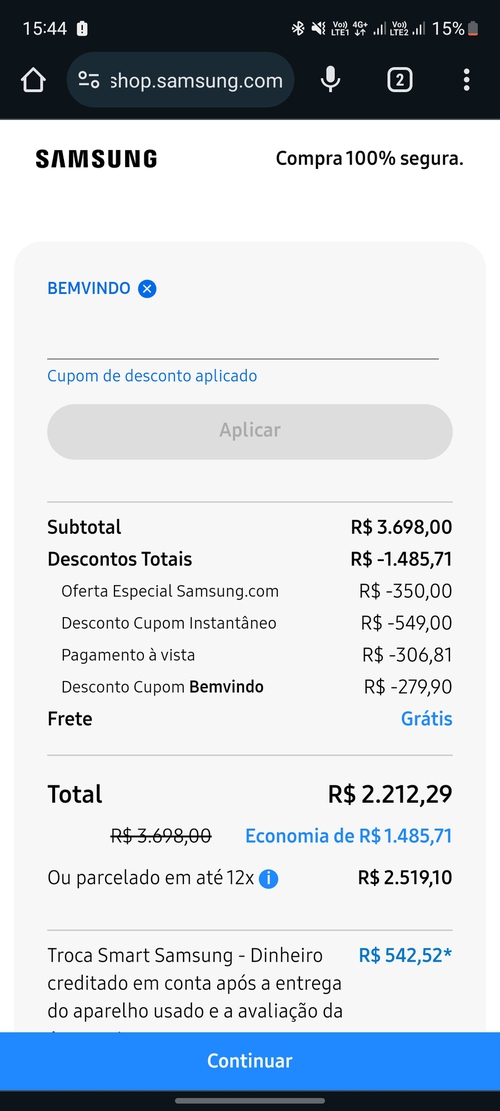 Mais na hora de finalizar a compra esse cupom de bem vindo some e o valor aumentou para 1800 e pouco avista