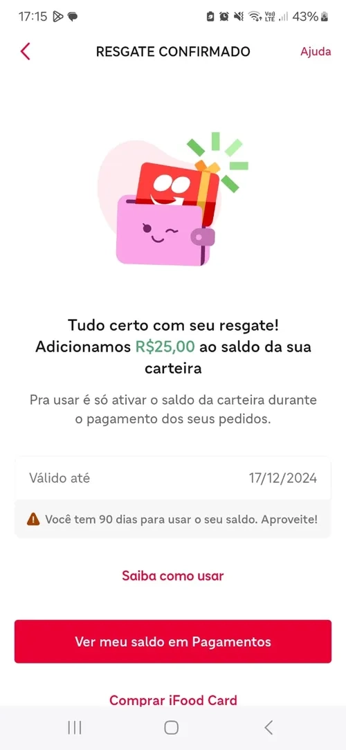 Minha gente, o meu rolou hein, e no lugar de 10,00 as 20 estrelas viraram um crédito de 25,00 no ifood