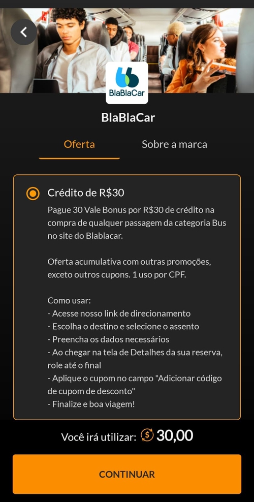 Troque 30 Vale Bônus por R$ 30 de Crédito na compra de qualquer passagem de Ônibus no BlaBlaCar