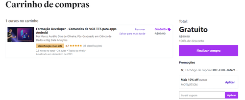 Fora que, 13h atrás, como tu quer que não expire? Sem falar na nova política da Udemy em que os cupons só podem ser resgatados por até mil pessoas (isso os estrangeiros, brasileiro é tão ruim que quando coloca cupom, só dá pra uma meia dúzia resgatar).