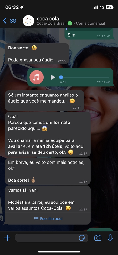 Essa foi a melhor que consegui fazer e não deu hahahahaPelo visto se voce compra uma coca cola em dezembro e manda o cupom, voce tem 24h para poder mandar o audio quantas vezes quiser.... pelo visto funciona.