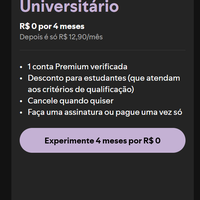"Grátis por quatro meses, depois R$ 12,90 por mês. Oferta disponível apenas para universitários que nunca tiveram o Premium antes e que estudem em instituições de ensino superior aprovadas."