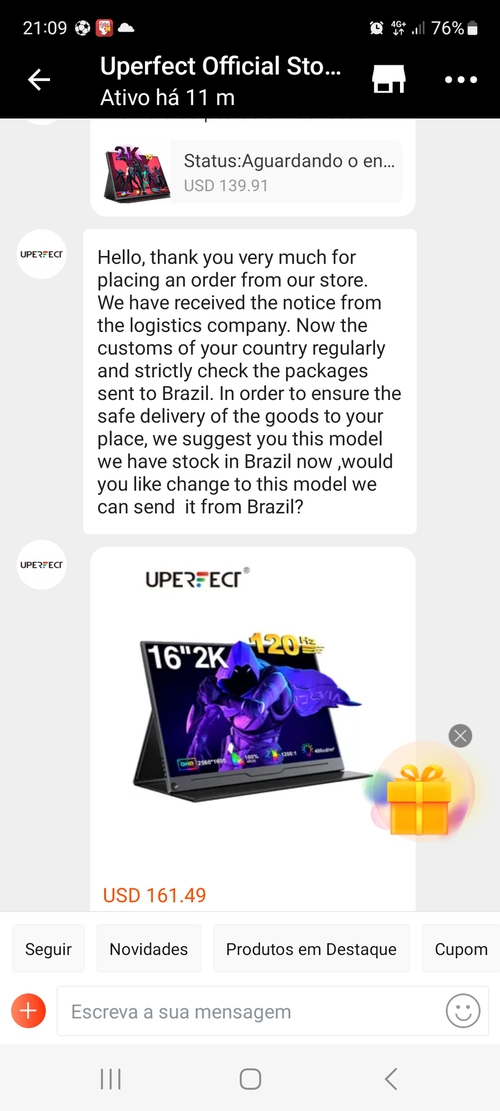 Eu peguei semana passada por 650 um da Uperfect 2K 120Hz e os tonto dos chineses me falaram se eu quero trocar para um modelo que envia do Brasil por conta da alfândega brasileira, os dois são muito parecidos e agora não sei se aceito ou cancelo.