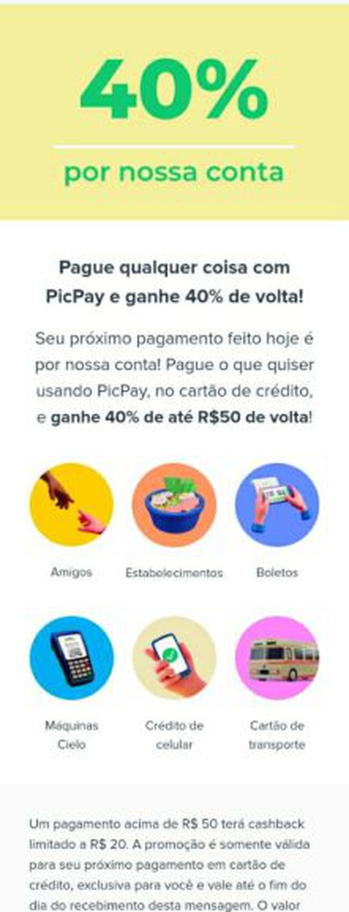 [Usuários Selecionados] 40% de Cashback em pagamentos no PicPay