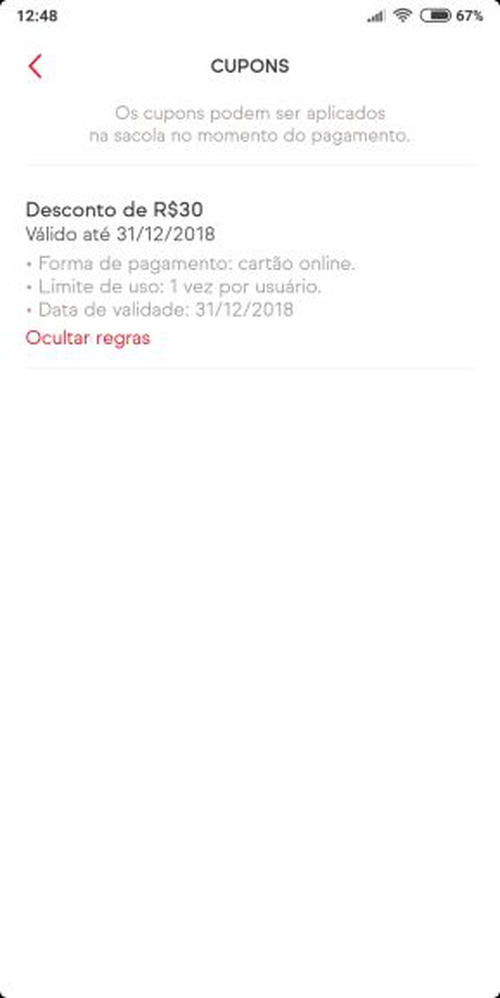 ATUALIZAÇÃO: Galera, de acordo com informações, é possível que esse cupom seja apenas para os usuários que TIVERAM SEUS PEDIDOS CANCELADOS NA BLACK FRIDAY. Nada confirmado, é apenas uma possibilidade. Quem teve seu pedido cancelado, acesse o aplicativo e veja se você foi contemplado.