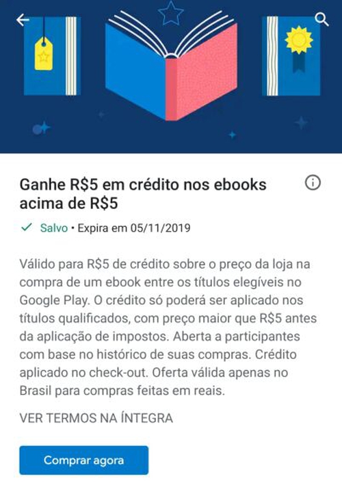 Válido para R$5 de crédito sobre o preço da loja na compra de um ebook entre os títulos elegíveis no Google Play. O crédito só poderá ser aplicado nos títulos qualificados, com preço maior que R$5 antes da aplicação de impostos. Aberta a participantes com base no histórico de suas compras. Crédito aplicado no check-out. A oferta expira quatro semanas após o resgate. Limite de 1 por usuário. Oferta válida apenas no Brasil para compras feitas em reais. Necessário ter conta no Google Payments. Aplicam-se restrições de idade no Google Play. Consulte os