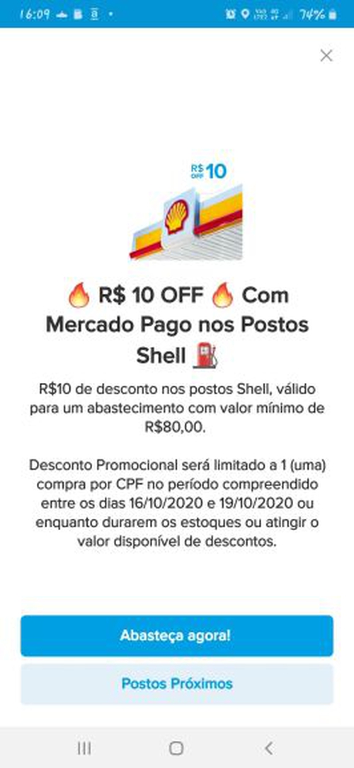 [USUÁRIOS SELECIONADOS] R$ 10 OFF apartir 80 reais nos postos Shell pelo app mercado pago